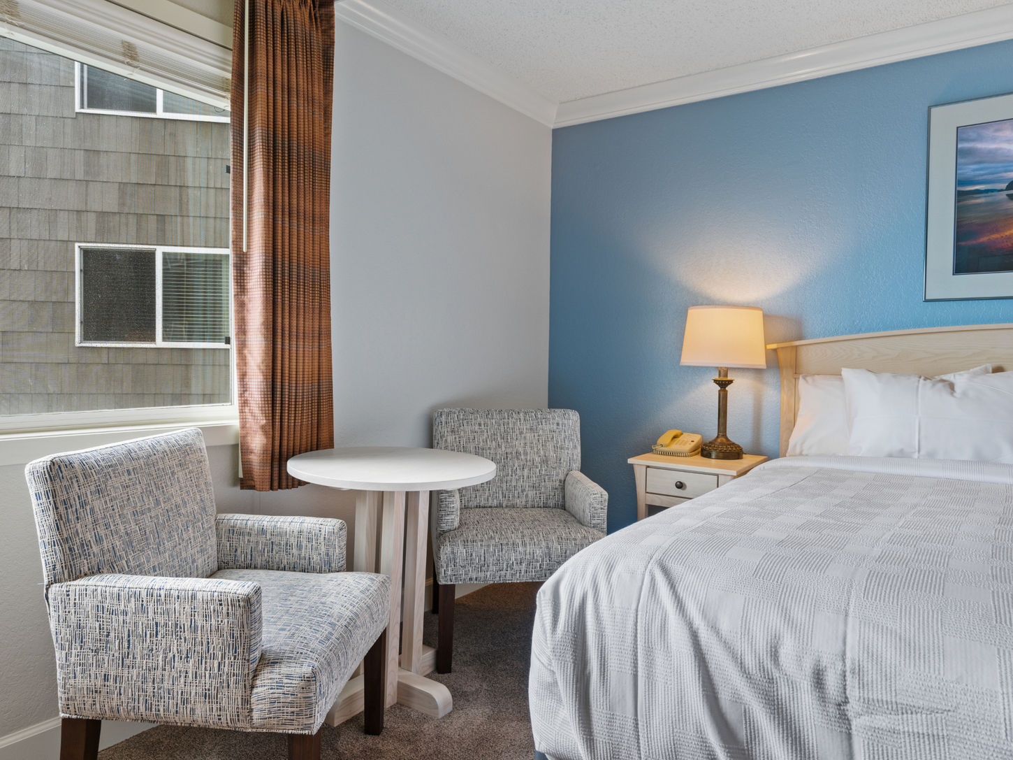Our non-view corner king rooms are perfect for travelers seeking extra space and enhanced amenities. Each room features a comfortable king bed, along with a microwave and mini fridge for added convenience. It's the ideal choice for those looking to explore the coast and return to a relaxing, restful night’s sleep.